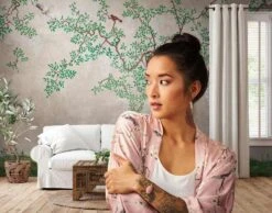 Digitaldruck mit einem Baum und Vögeln in grau, grün, braun – 38233-1 | 382331